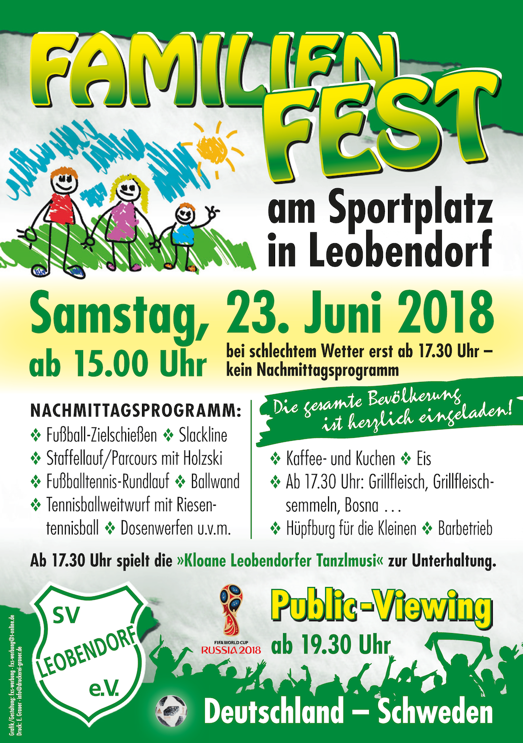 Am Samstag, den 23. Juni 2018 findet das Familienfest des SV Leobendorf statt. Beginn ist um 15:00 Uhr, bei schlechtem Wetter erst ab 17:30 Uhr (kein Nachmittagsprogramm). Die gesamte Bevölkerung ist herzlich eingeladen.